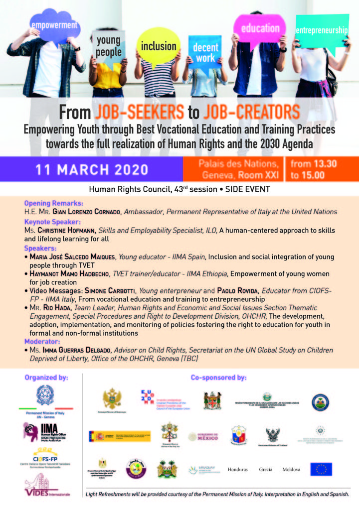Un grande evento ci attendeva oggi, 11 marzo, al Palazzo delle Nazioni Unite di Ginevra, all’interno della 43ª sessione di lavoro del Consiglio per i Diritti Umani. Organizzato dall’Ufficio Diritti Umani delle Salesiane di Don Bosco, da CIOFS-FP e dalla Missione permanente d’Italia, l’evento trattava un tema molto importante per la Formazione Professionale:  “From Job-seekers to Job-creators: Empowering Youth through Best Vocational Education and Training Practices towards the full realization of Human Rights and the 2030 Agenda” (Dal cercare lavoro al creare opportunità lavorative: l’empowerment di adolescenti e giovani nei Centri di Formazione professionale).